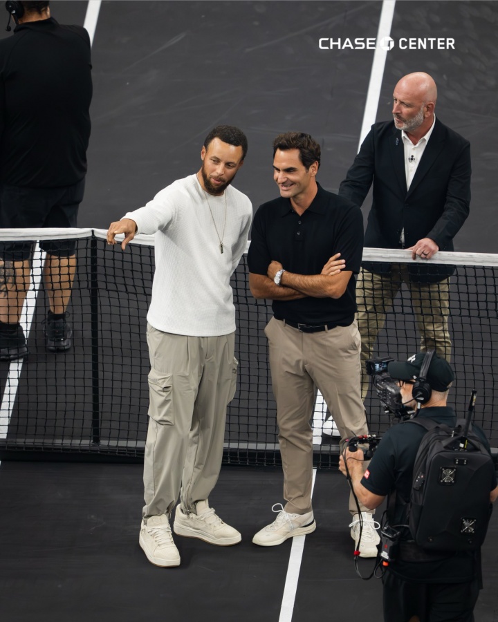 他与费德勒以及参赛选手们进行了合影,还抛硬币为比赛“开球”。