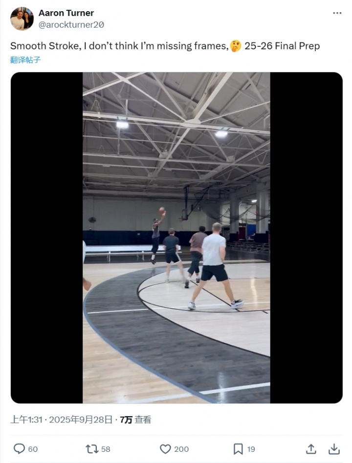 Aaron Turner今日再次晒出了库明加的最新接球投篮视频,并写道:“多么丝滑的投篮,我不认为有抽帧行为,25-26赛季最后的准备。”
