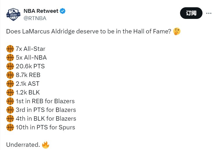 8月23日讯 今天,美媒NBA Retweet晒出了阿尔德里奇职业生涯的数据和荣誉,并在旁边发问:“阿尔德里奇是否值得入选名人堂?”