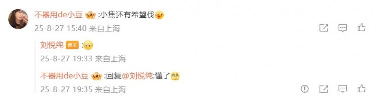 有网友问焦泊乔,刘悦纯回复了一个失望的表情。