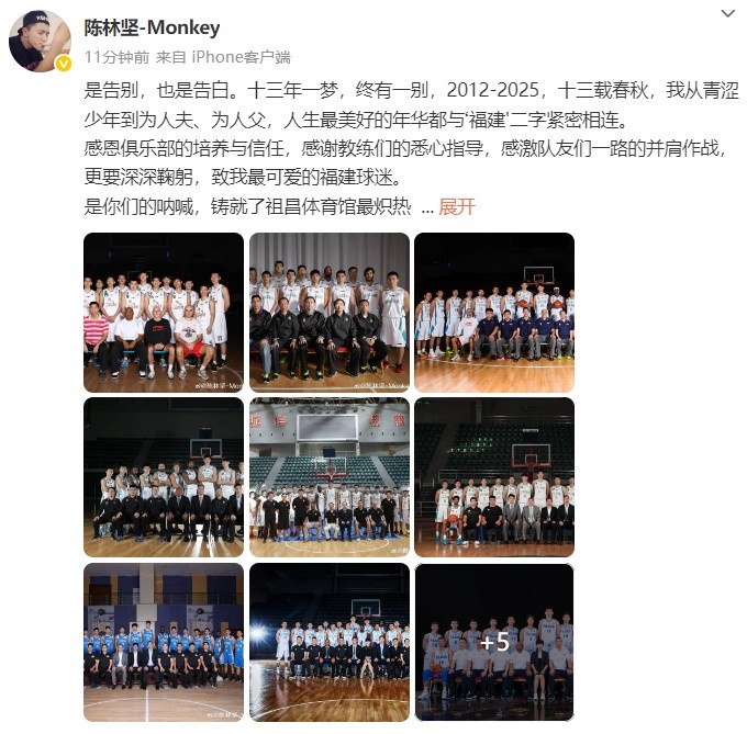 今天,陈林坚晒出多张与福建男篮将帅们的合影,并发文深情告别道:“是告别,也是告白。十三年一梦,终有一别,2012-2025,十三载春秋,我从青涩少年到为人夫、为人父,人生最美好的年华都与‘福建'二字紧密相连。