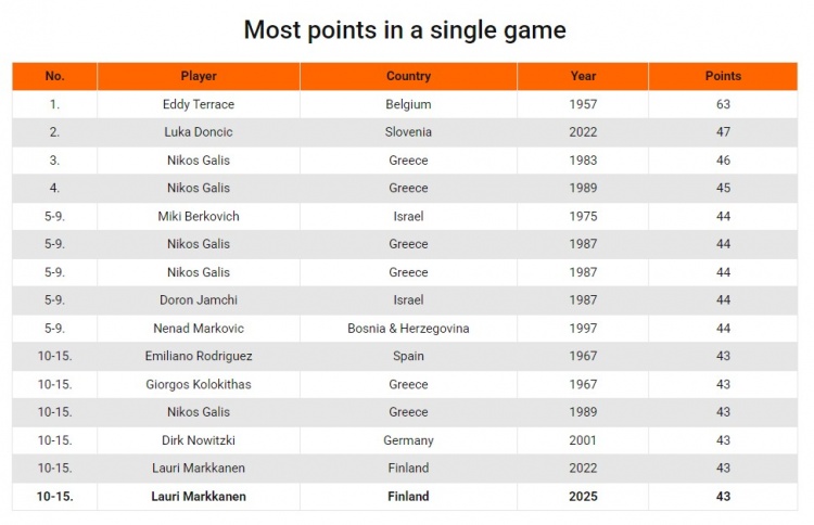 这是马尔卡宁第二次在欧锦赛上砍下43分,43分的得分在欧锦赛历史单场得分榜上并列第10。诺维茨基、尼科斯-加里斯、乔治斯-科洛基塔斯、埃米利亚诺-罗德里格斯也有过单场43分的表现。