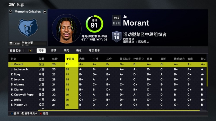 2K26灰熊能力值:莫兰特91! 贾伦-杰克逊89 二年级埃迪79排第三_篮球新闻_蜘蛛直播