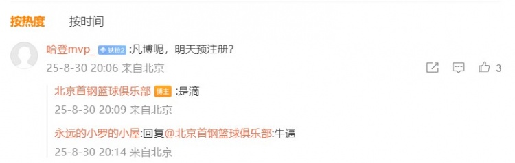 有网友询问是否明天会给曾凡博预注册,北京男篮官博回复:“是滴。”