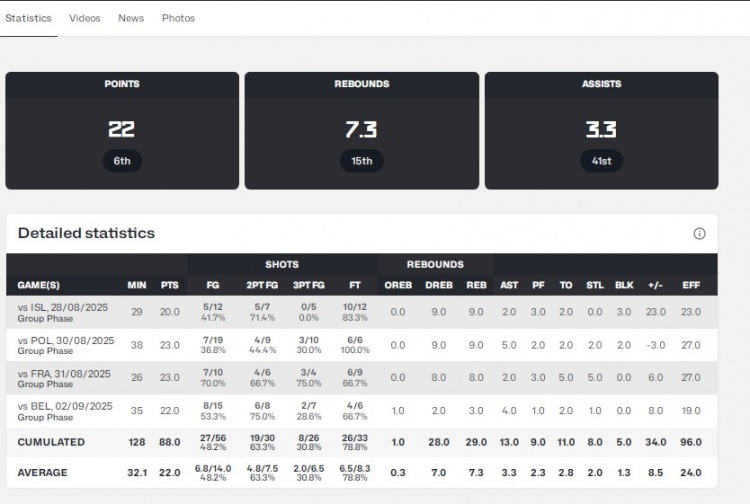 四场欧锦赛小组赛,阿夫迪亚场均可以拿到22分7.3篮板3.3助攻2.0抢断1.3盖帽。