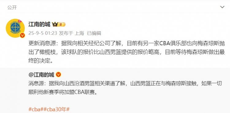 @江南的城 之后继续报道:“更新消息源:据我向相关经纪公司了解,目前有另一家CBA俱乐部也向梅森-琼斯抛出了橄榄枝,该球队的报价比山西男篮提供的报价略高,目前等待梅森-琼斯做出最终的决定。”
