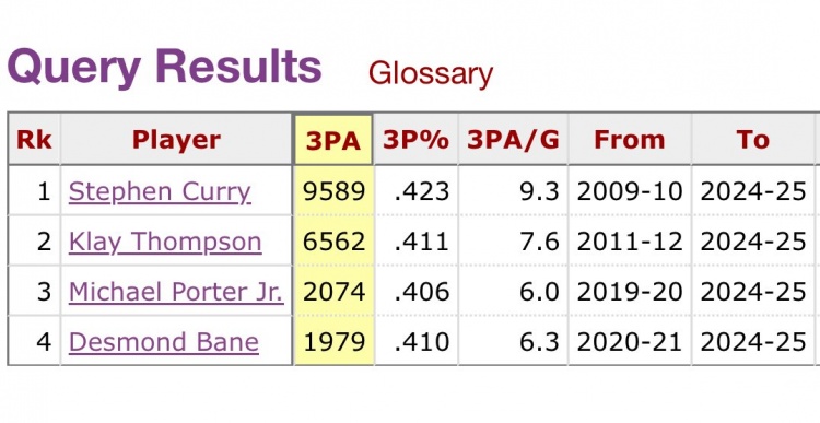 9月9日讯 据数据网站Basketball Reference统计,NBA历史仅4人生涯场均投6+三分且命中率40%+,他们分别是: