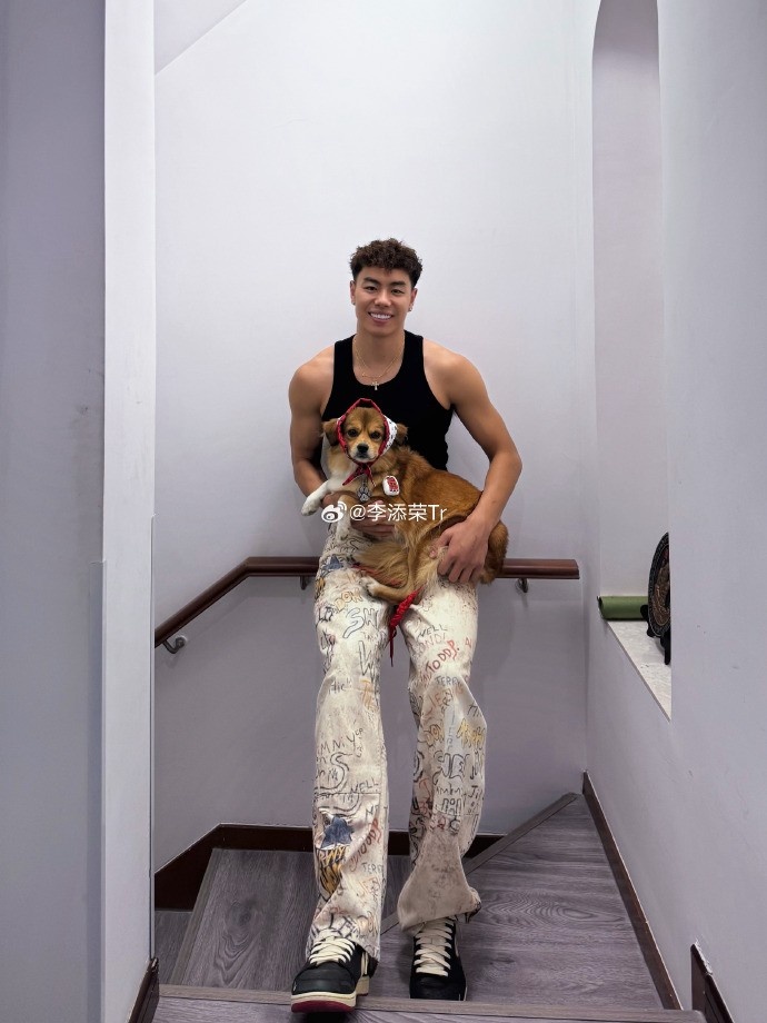 李添荣配文写道:“帅小狗🐕and帅小孩👶”