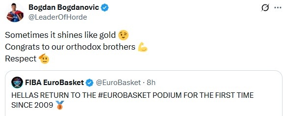 快船球员博格丹-博格达诺维奇发推祝贺希腊队:“有时(铜牌)就像金牌一样闪闪发光😉