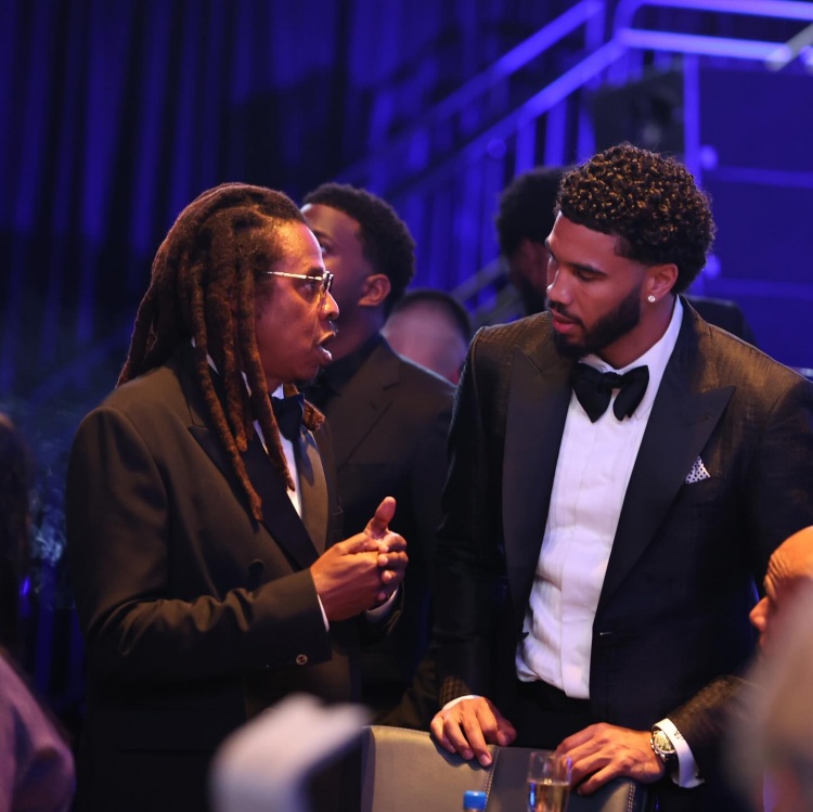 从照片中可以看到说唱巨星Jay-Z、演员凯文-哈特、NFL球员奥戴尔-贝克汉姆、NBA球员唐斯、布克、哈利伯顿等人。