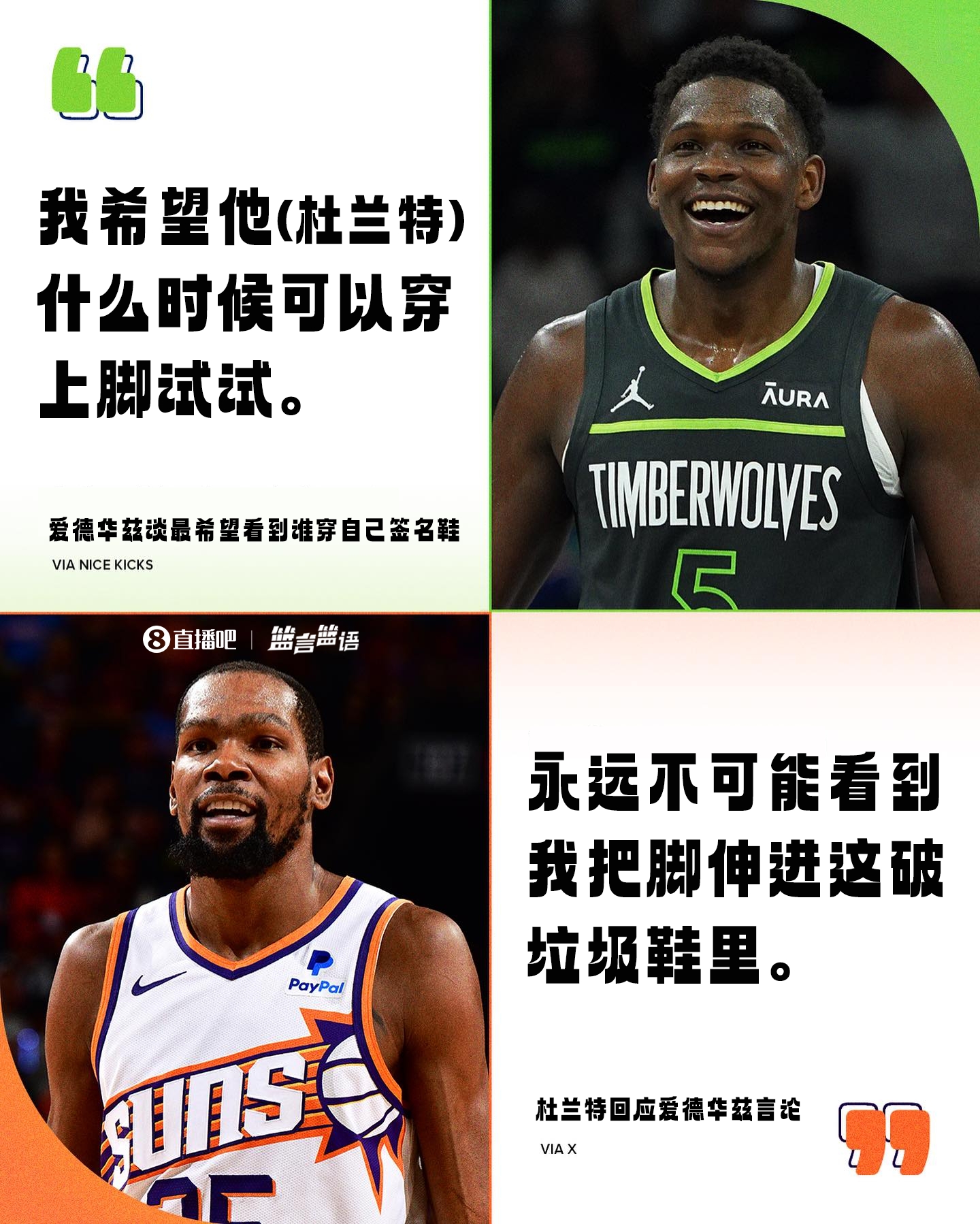 2023年爱德华兹首次推出签名鞋时,他说最希望杜兰特穿自己的签名鞋,但杜兰特是NIKE旗下的球员,不可能穿竞品的鞋子,当时他在推特上直接回复道:“永远不可能看到我把脚伸进这破垃圾鞋里(Mfers=mother f*ckers)!”还引发了一些争议。