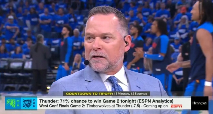 上赛季,在常规赛还剩不到一周的情况下,掘金做出了令人震惊的决定,解雇迈克尔-马龙。这位总冠军教头很快就找到了“新家”,加入到ESPN节目《NBA Countdown》参与西决报道。