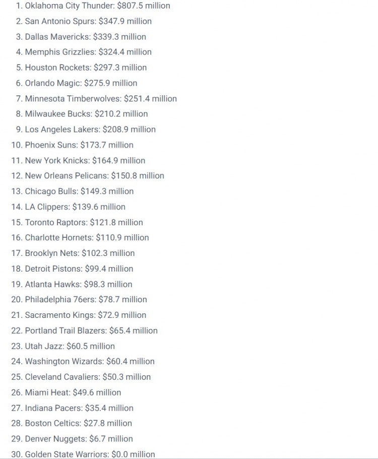 雷霆8.07亿美元居首,马刺、独行侠、灰熊、火箭分列第2到第5位,勇士暂时垫底,还没花过钱。