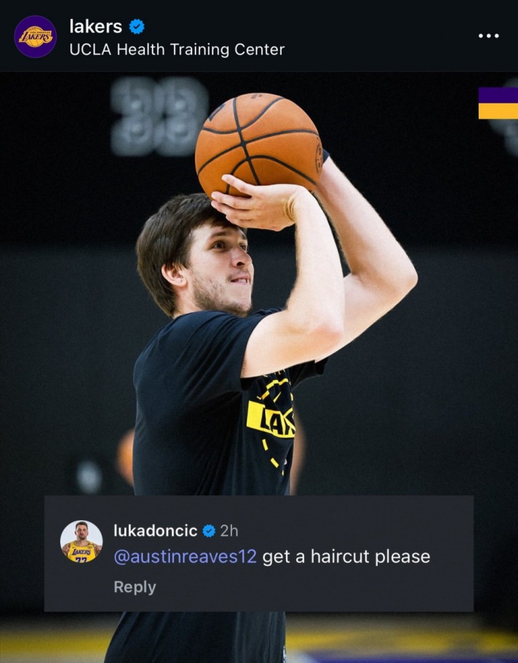 湖人后卫东契奇在湖人官方账号的评论区留言:“@里夫斯 请你理个发吧。”