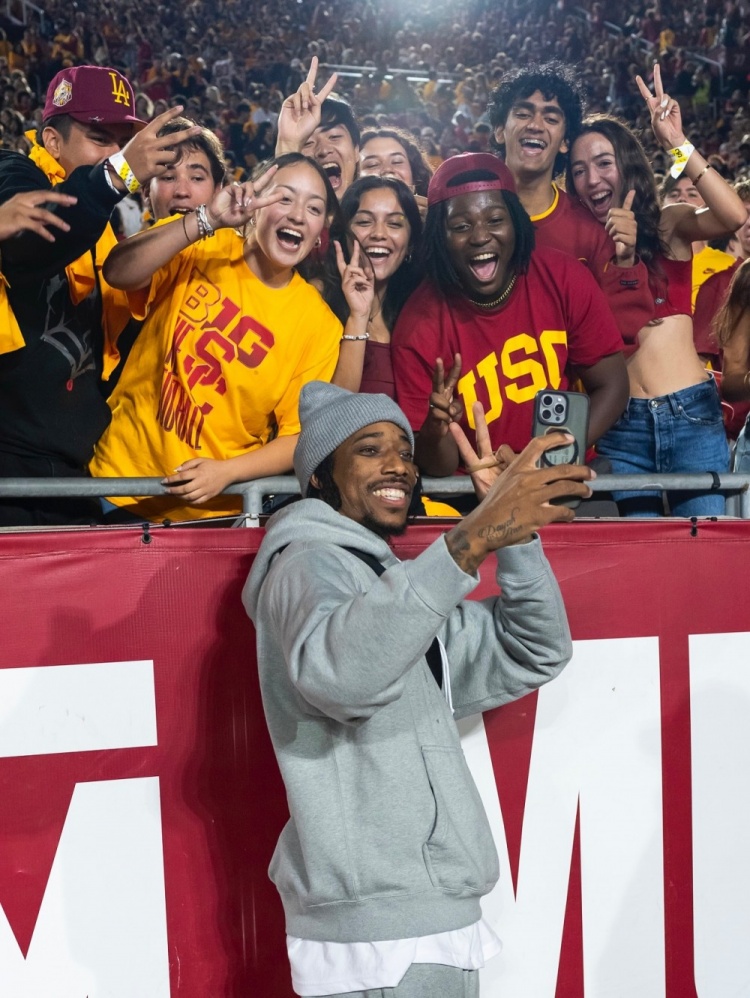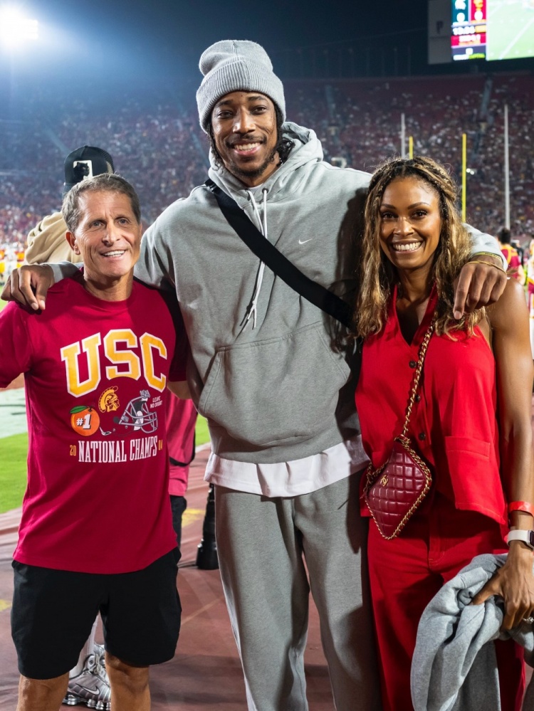 9月22日讯 南加大篮球队社媒更新动态,晒出了校友、NBA球员德罗赞回到母校观看校橄榄球队的比赛照片,德罗赞在现场也是热情的和学弟、学妹们互动。