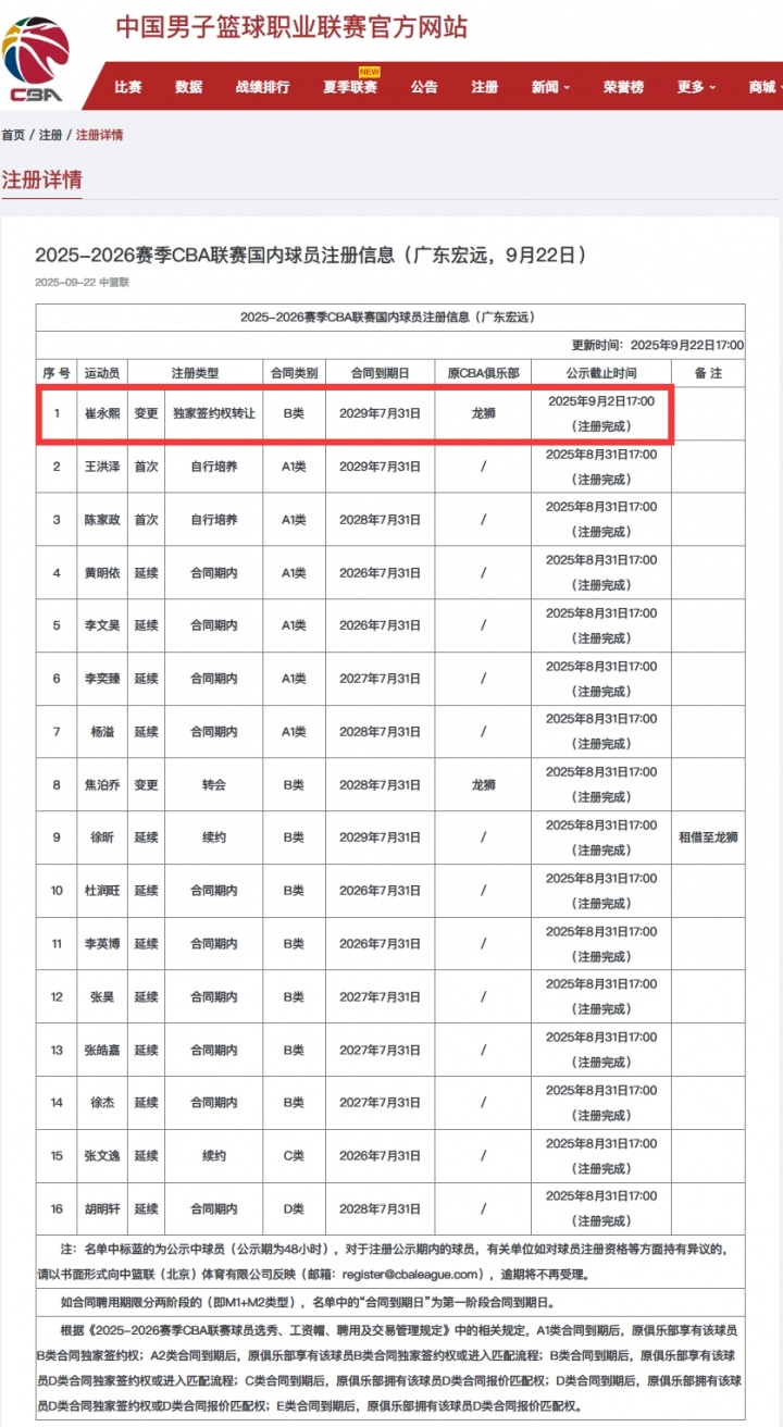 其中广东宏远已成功为崔永熙完成注册,并与其签下四年B类合同,合同将于2029年7月31日到期。