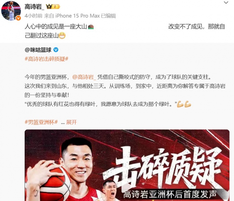高诗岩转发了该采访,然后配文写道:“人心中的成见是一座大山⛰️ 改变不了成见,那就自己翻过这座山。”