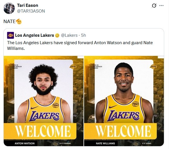 9月28日讯 湖人官方宣布,球队正式签下前锋安东-沃特森和后卫内特-威廉姆斯。