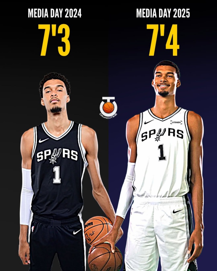 美媒从名单上发现,21岁的文班亚马长高了1英寸,去年媒体日时他的身高是7英尺3英寸(约2米21),现在是7英尺4英寸(约2米24)。