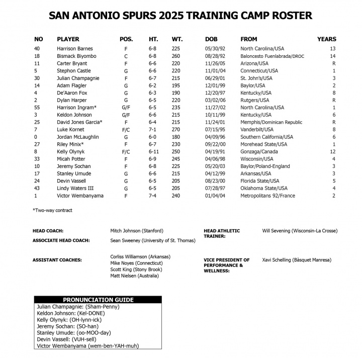 09月30日讯 NBA球队媒体日,马刺公布了训练营名单。