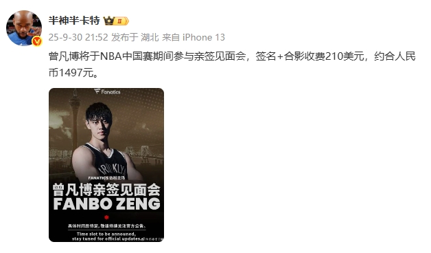 近日,媒体人@半神半卡特在社媒上透露,曾凡博的亲签见面会签名+合影收费210美元,约合人民币1497元。