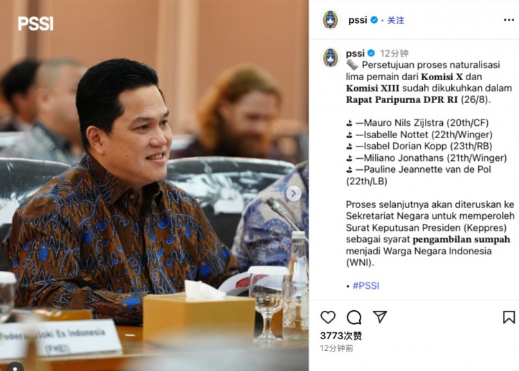 归化+5预定,印尼足协宣布推动乔纳森等5名男女足球员的归化日程