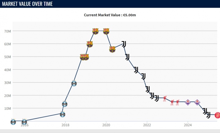 据德转数据,阿图尔与尤文的合同将于2027年到期,这位曾经的天才中场也从巅峰时期7000万欧元身价,跌至如今的500万欧元。