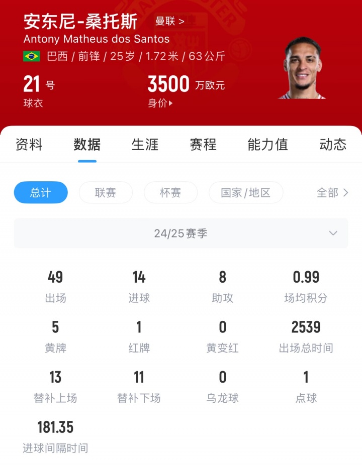 安东尼上赛季各赛事共出战49场,打进14球助攻8次。租借贝蒂斯期间,安东尼多次示爱贝蒂斯,表达留下意愿。