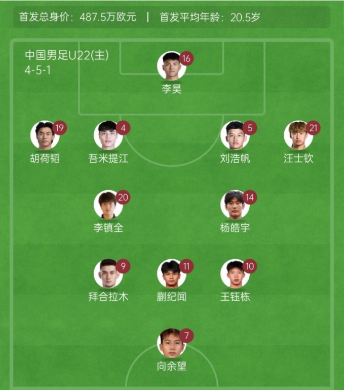 上场U22国足2-1东帝汶U23首发:16-李昊、4-吾米提江、5-刘浩帆、19-胡荷韬、21-汪士钦、10-王钰栋、11-蒯纪闻、14-杨皓宇、20-李镇全、7-向余望、9-拜合拉木