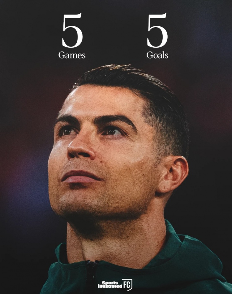 据媒体统计,C罗年满40岁之后为葡萄牙出战5场比赛,打进5球,场均攻入1球。