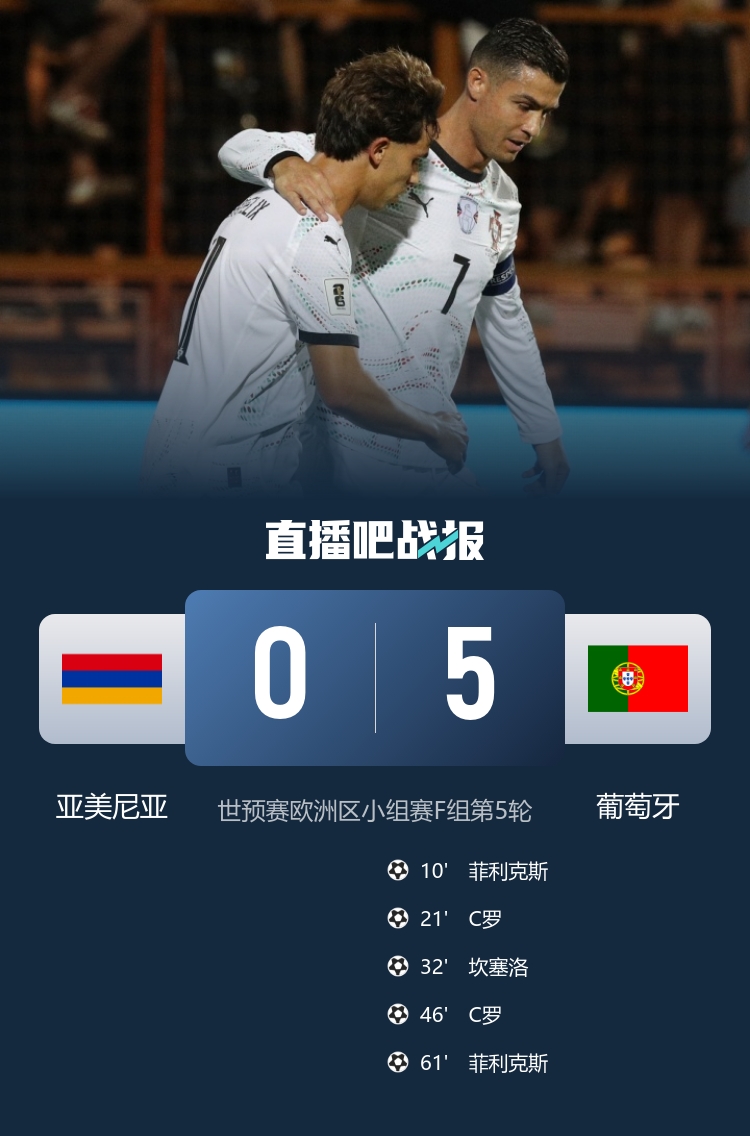 葡萄牙世欧预本轮5-0横扫亚美尼亚,C罗、菲利克斯双响,坎塞洛破门!