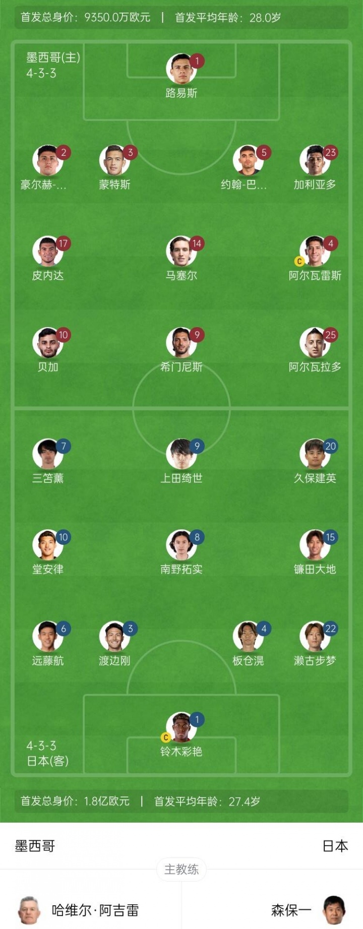 今日日本对阵世界排名高自己4名的墨西哥,两队势均力敌,握手言和。日本队这场比赛全主力首发,队内球星包括利物浦的远藤航、布莱顿的三笘薰、皇家社会的久保建英、摩纳哥的南野拓实、法兰克福的堂安律等一众名将,首发身价1.8亿欧是墨西哥的2倍。