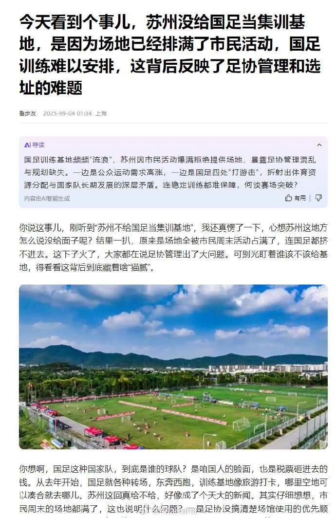 不少自媒体近日又凭空捏造了“国足9月到苏州集训,苏州以场地紧张优先供给群众使用为由拒绝”的谣言。且不说目前国足主帅尚未落实,最近也无集训计划(早在年初就公布了集训计划),这个谣言显得假到离谱。