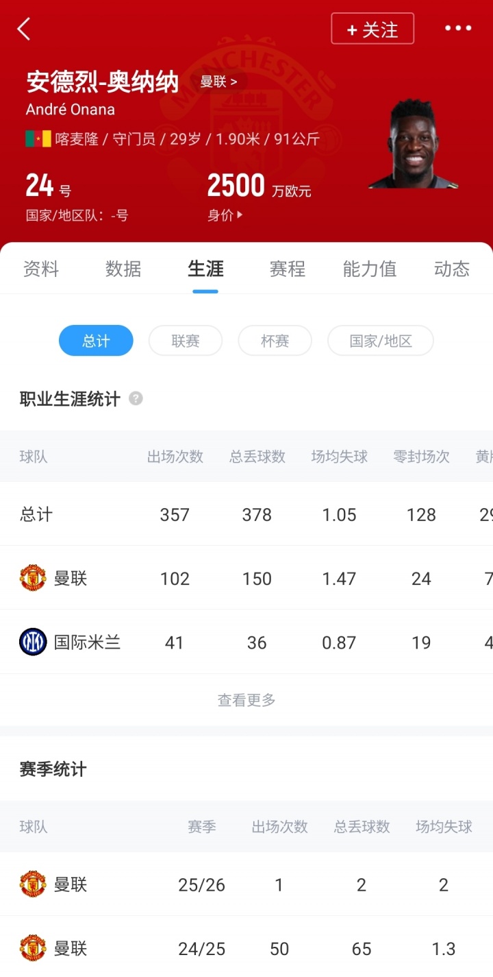 曼联2023年花费5020万欧转会费从国米签下奥纳纳,截止目前球员代表曼联出战102场比赛,丢掉150球,完成24次零封。球员德转身价2500万欧。