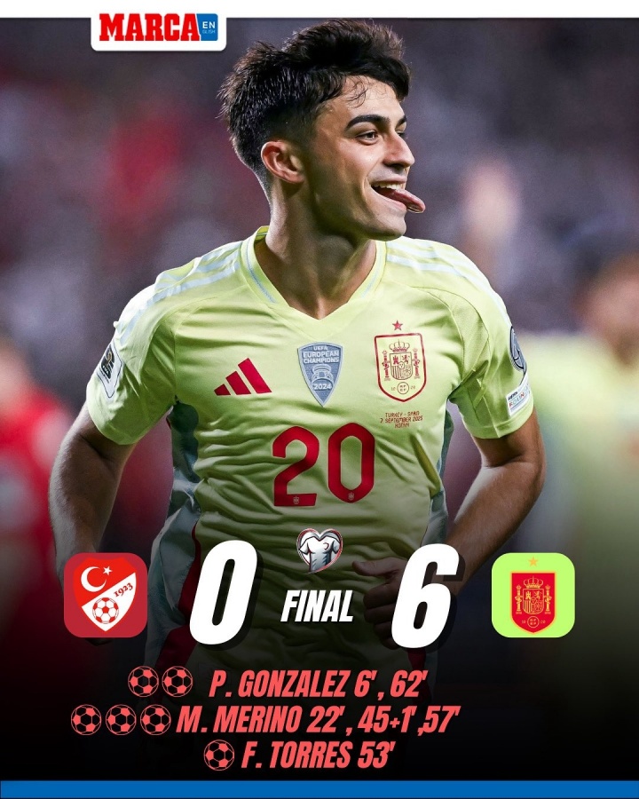 西班牙6-0大胜土耳其,巴萨22岁中场核心佩德里打入两粒进球。
