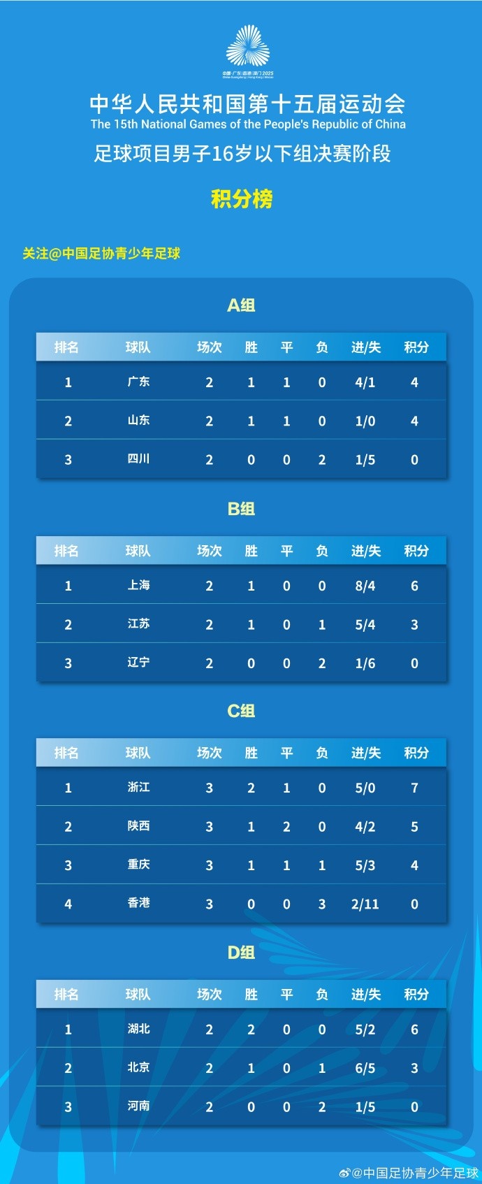 中华人民共和国第十五届运动会足球项目男子16岁以下组决赛阶段第三比赛日赛果和积分榜 🎙️