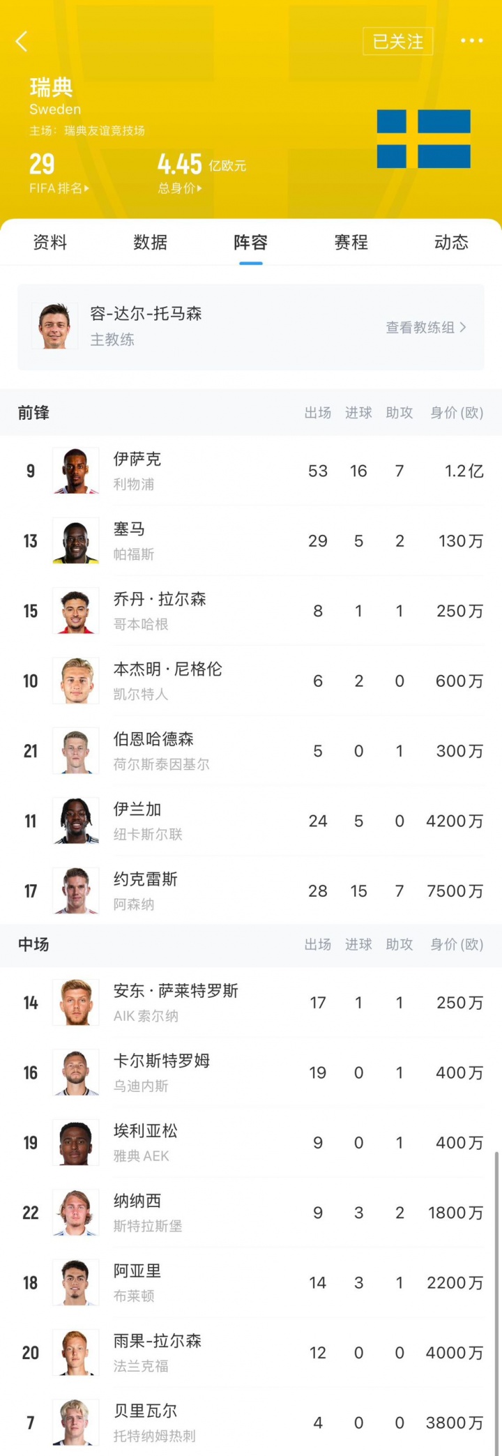 瑞典全队身价高达4.45亿欧,位列世界第10,阵中有身价1.2亿欧的伊萨克(利物浦)、7500万欧的约克雷斯(阿森纳)、4200万欧的伊兰加(纽卡)、4000万欧的雨果-拉尔森(法兰克福)、3800万欧的贝里瓦尔(热刺)和3000万欧的希恩(亚特兰大)。