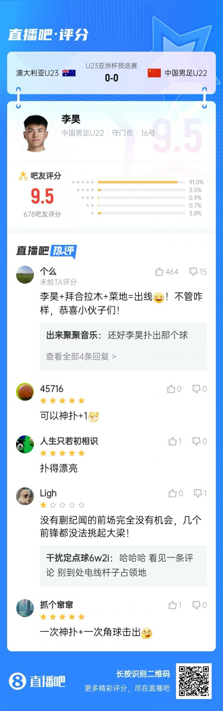 没你真不行!李昊贡献神扑力保球门不失,吧友给他打出9.5的高分