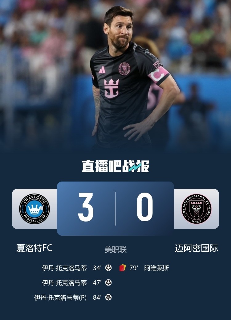 9月14日讯 北京时间9月14日上午7:30,美职联迈阿密国际做客美国银行体育场挑战夏洛特FC。上半场,梅西造点但勺子点球没有命中,托克洛马蒂破门。下半场,托克洛马蒂戴帽,布斯克茨送点,阿维莱斯染红。全场结束,迈阿密国际0-3夏洛特FC。本场过后,迈阿密国际近5轮联赛仅1胜,他们目前积46分排名东区第六;夏洛特FC积53分暂升东区第二。