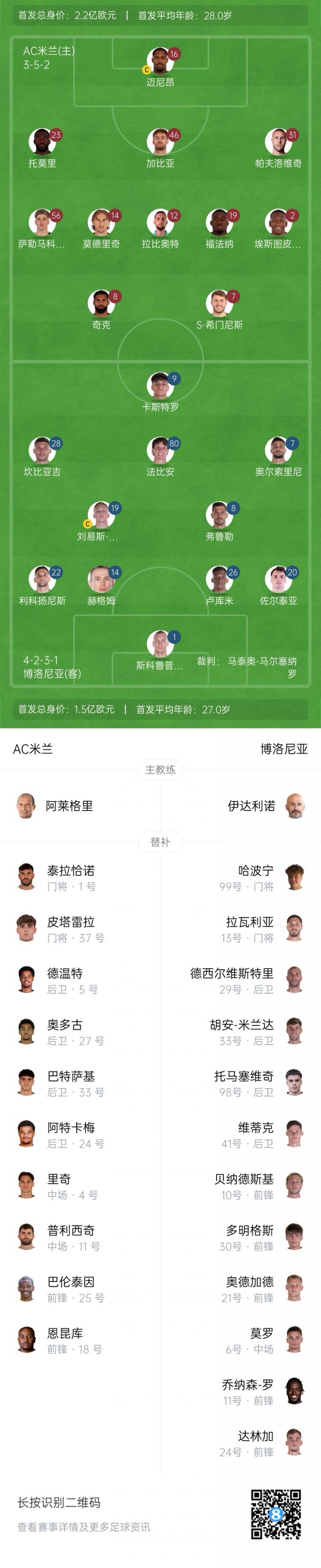 博洛尼亚替补:99-哈波宁、13-拉瓦利亚、29-德西尔维斯特里、33-胡安·米兰达、41-维蒂克、98-托马塞维奇、6-莫罗、11-乔纳森·罗、21-奥德加德、24-达林加、10-贝纳德斯基、30-本哈明·多明戈斯