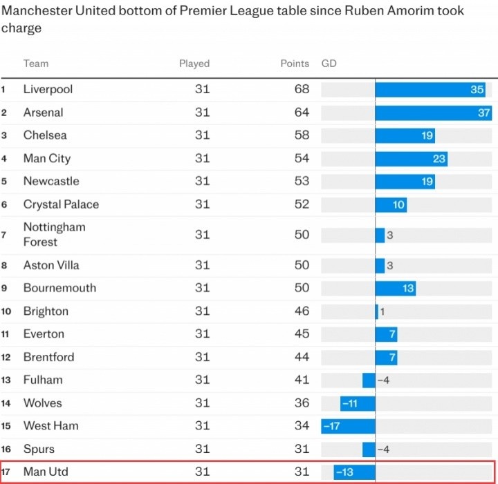自阿莫林上任以来,曼联在英超积分垫底、净胜球倒数第二(除了已降级的三队)。