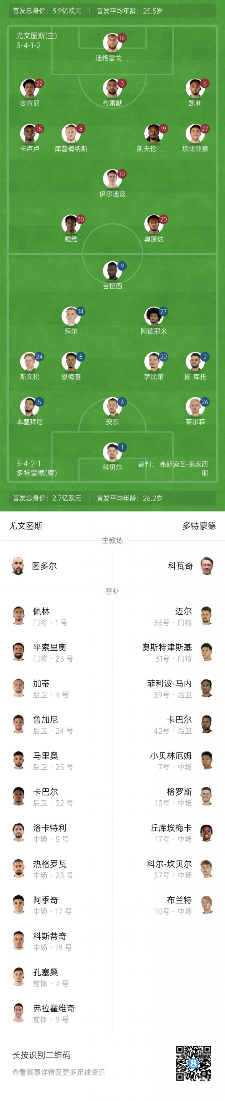 多特蒙德替补:33-迈尔、31-奥斯特津斯基、39-菲利波·马内、42-卡巴尔、7-小贝林厄姆、13-格罗斯、17-丘库埃梅卡、37-科尔·坎贝尔、10-布兰特