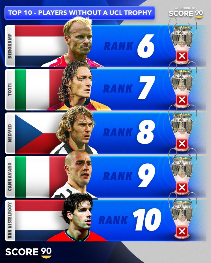 外媒Score90列无欧冠球员TOP10: