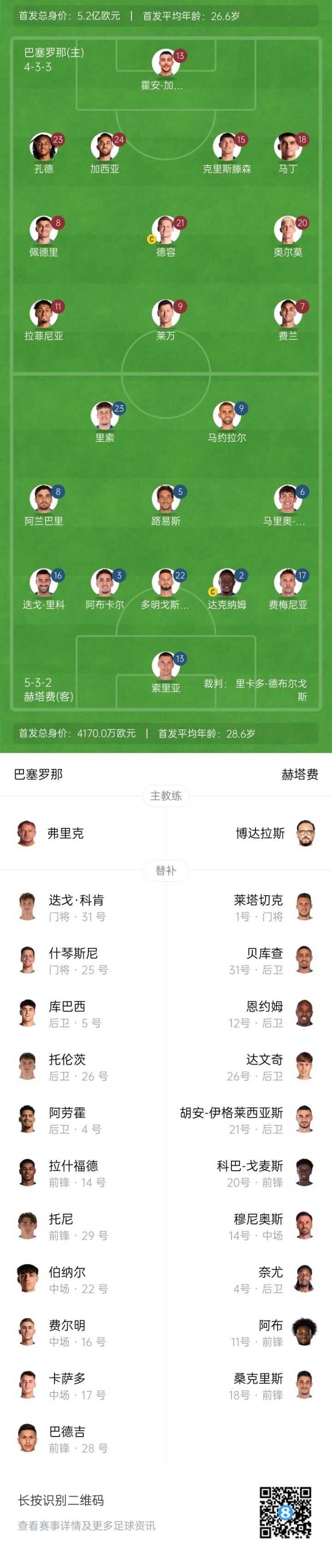 巴萨首发:13-霍安·加西亚、24-埃里克·加西亚、15-克里斯滕森、18-赫拉德·马丁、23-孔德、8-佩德里、20-奥尔莫、21-德容、7-费兰、11-拉菲尼亚、9-莱万