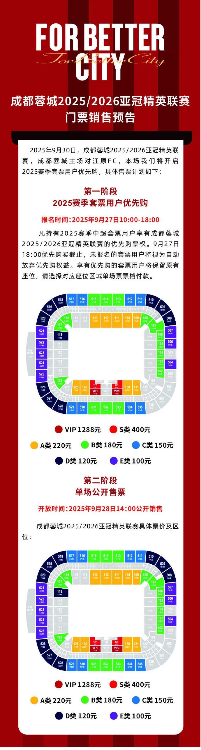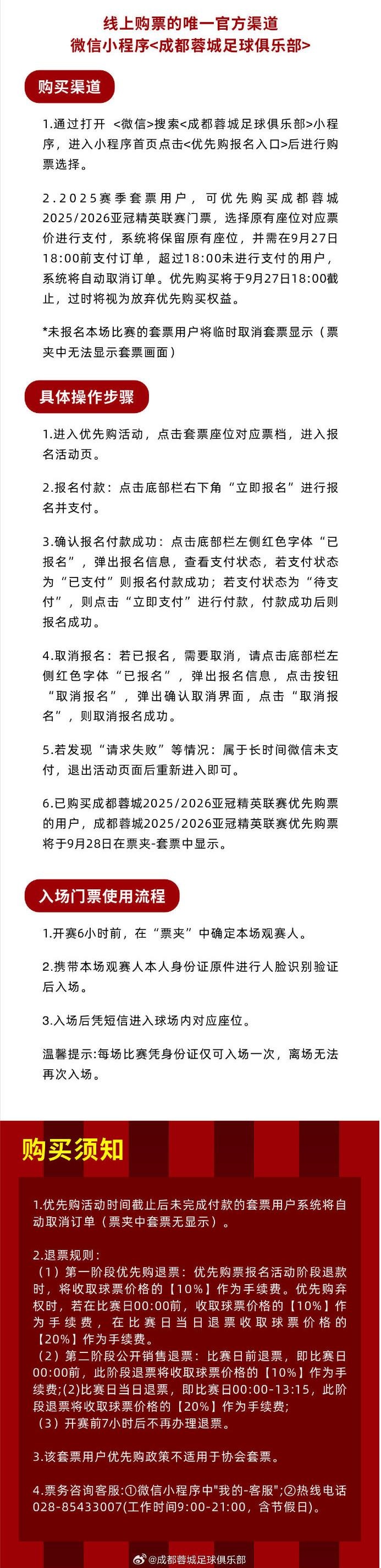 2025/2026亚冠精英联赛第2轮,成都蓉城vs江原FC主场比赛球票优先购、单场公开售票将于近期陆续开启,线上购票相关购买须知、进场及检票方式等信息可通过图片详情了解,请务必仔细阅读,定好闹钟。