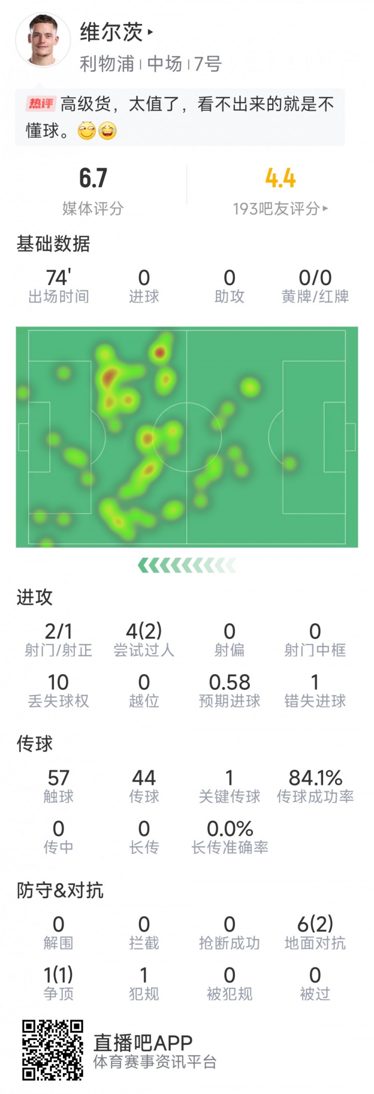 维尔茨加盟利物浦已经踢了7场正式比赛(社区盾不算),至今仍0球0助。而本场比赛他也几乎毫无贡献,场上的关键镜头也非常少。
