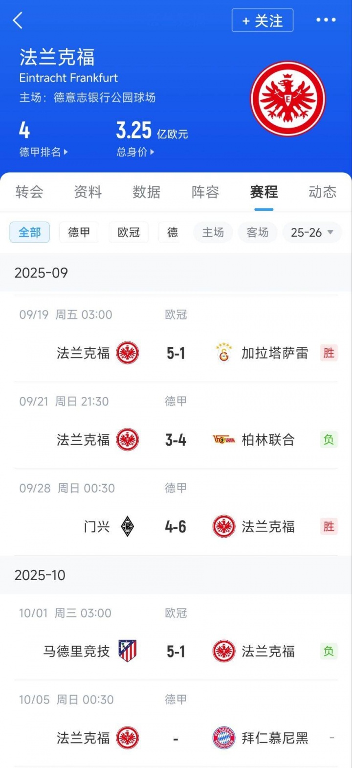 近4场比赛,法兰克福的战绩:5-1加拉塔萨雷,3-4柏林联合,6-4门兴,1-5马竞,每场比赛至少6球,不是你死就是我亡。下一场比赛,法兰克福主场迎战拜仁。