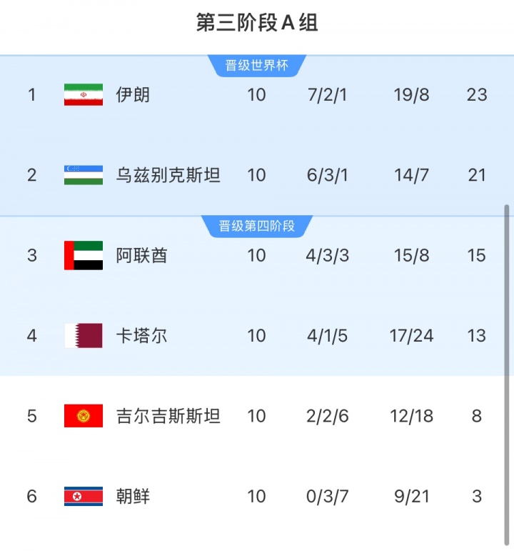 世界杯预选赛第三阶段,乌兹别克斯坦排名A组第二名,晋级2026年世界杯。