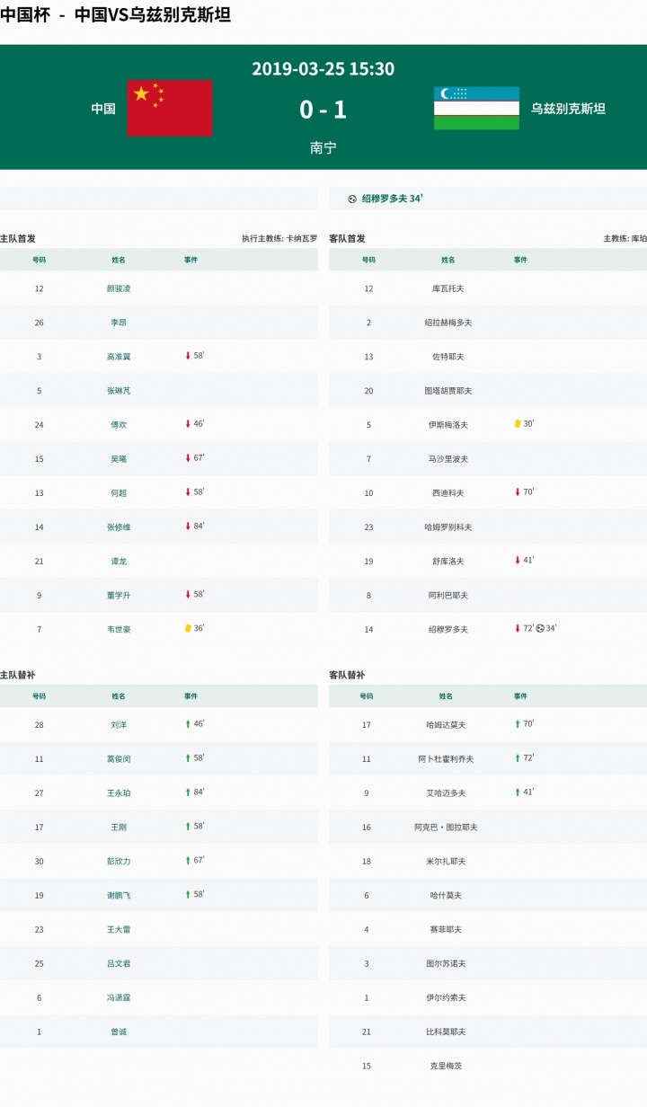 2019年3月25日,第三届中国杯季军争夺战在中国队和乌兹别克斯坦之间进行。上半场国足进攻端毫无亮点,绍穆罗多夫爆射破门,韦世豪凶狠飞铲染黄,下半场对方错失多次良机。最终国足0-1不敌乌兹别克斯坦,当届中国杯两连败且一球未进,排名垫底。