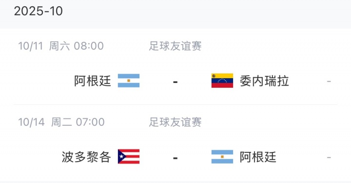 阿根廷10月将进行两场友谊赛,11号对阵委内瑞拉,14号对阵波多黎各。